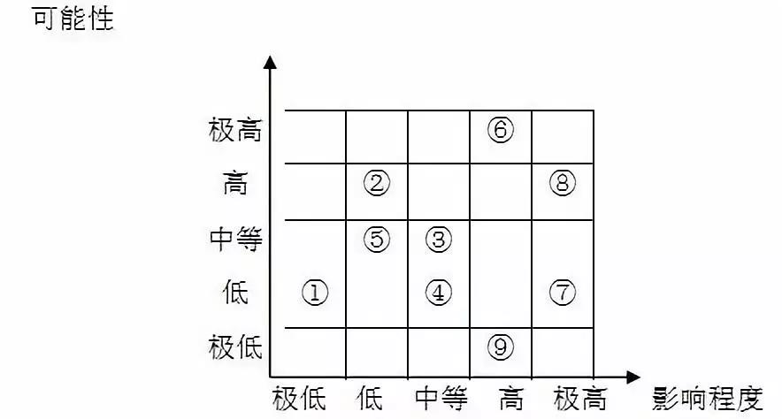 对风险发生可能性的高低和风险对目标影响程度进行定性或定量评估后,依据评估结果绘制风险坐标图。如:某公司对9项风险进行了定性评估,风险①发生的可能性为“低”,风险发生后对目标的影响程度为“极低”;……;风险⑨发生的可能性为“极低”,对目标的影响程度为“高”,则绘制风险坐标图如下: