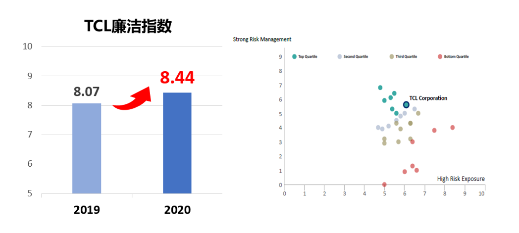 2020年TCL廉洁指数为8.44分,与2019年相比增加0.37分,总体呈现积极上升态势。与全球最大指数公司明晟(MSCI)对TCL2019年的反腐整体指数的评价趋势保持一致。不久前, MSCI公布了逾2800家企业ESG评级,对TCL2019年反腐整体指数评分为6.5,同比提升16.1%,整体评价从2018年的“略高于行业平均水平”升入“名列行业前茅”。值得一提的是员工有效问卷数与2019年相比增幅36.5%,表明员工参与廉洁建设的积极性和对公司的信任度有较大提升。