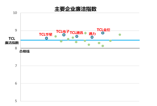 通过对TCL体系内17家主要企业和15个主要职能领域廉洁指数的分别测评,所有参评企业的廉洁评分均超过了8分,中位数为8.71分。14个参评职能领域廉洁评分超过了8分,中位数为8.55分。