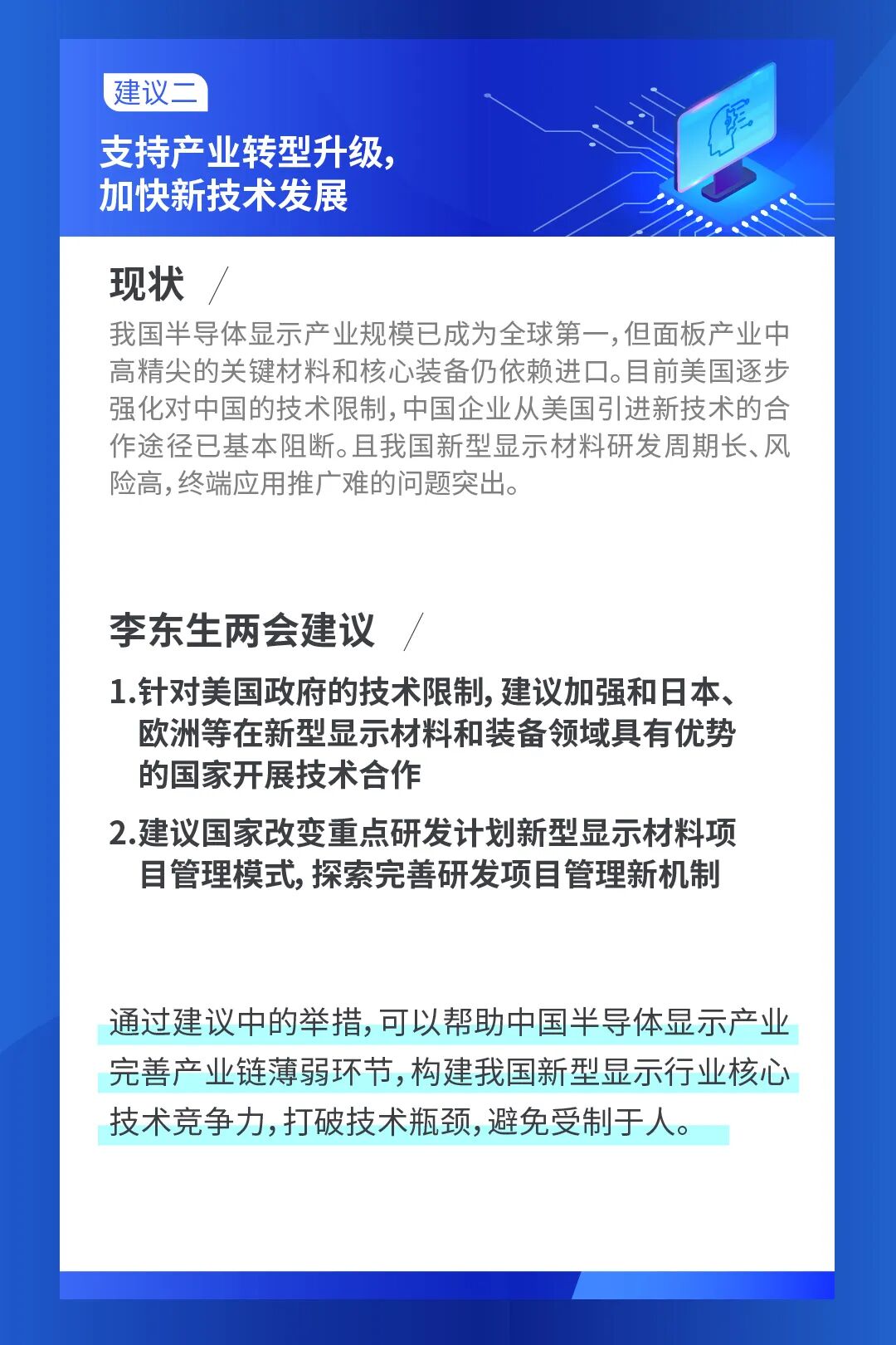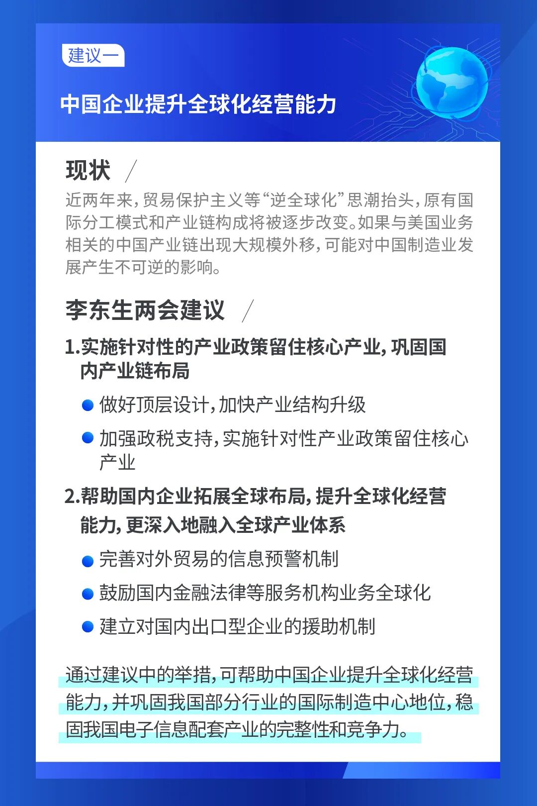 作为连任4届的全国人大代表,今年是李东生第18年履职,面对今年的特殊情况,他感触颇多。“在这个特殊节点开启两会,是中国在向世界昭示我们已经初步战胜疫情,整个社会已基本恢复常态,这将为全球抗疫增添信心!” 下面就带大家一起了解,全国人大代表、全国工商联副主席、TCL创始人、董事长李东生今年都会具体带来哪些两会建议吧。 关于经济全球化,李东生表达了自己坚定的观点:“全球化不会被按下暂停键,经济全球化是一个市场发展的选择,它对全球经济的发展会有很好的推动作用。中国企业要对全球化战略做出调整,不能够简单地把产品卖出去,而是要把产业链建在当地,在当地生产、服务,为当地的经济发展做出自己的贡献。” 作为中国企业全球化的标杆,TCL 历经20年的全球化发展,构建起涵盖设计研发、销售渠道、品牌营销、生产制造、供应链、服务等全球布局,目前已在全球拥有28个研发机构、10家联合实验室、22个制造基地,业务遍及160多个国家和地区。 目前TCL华星已建和在建的生产线共有6条,合计投资金额近2000亿元,已形成大、中、小尺寸齐备的产线格局,2019年更是取得电视面板市场份额全球第三,LTPS手机面板市场份额全球第二的成绩。 未来,TCL华星则着眼于努力实现从效率领先、产品领先到技术领先、生态领先,通过横向规模扩张和纵向产业链延伸,突破下一代新型显示技术和材料,进而引领全球显示行业发展。 李东生表示:“交易时间的减少,将增加交易对冲的风险,企业可能因此会蒙受损失,比如说股票在中国上市、在香港上市,也在美国上市。但美国市场在交易,香港市场在交易,中国市场不能交易,这将增加额外风险。” 谈及今年参会的期待,李东生充满乐观和自信:“我对中国会继续加快自身经济发展有信心,面对全球经济环境在疫情影响下的困难和挑战,中国将继续成为全球经济发展的重要组成部分。”