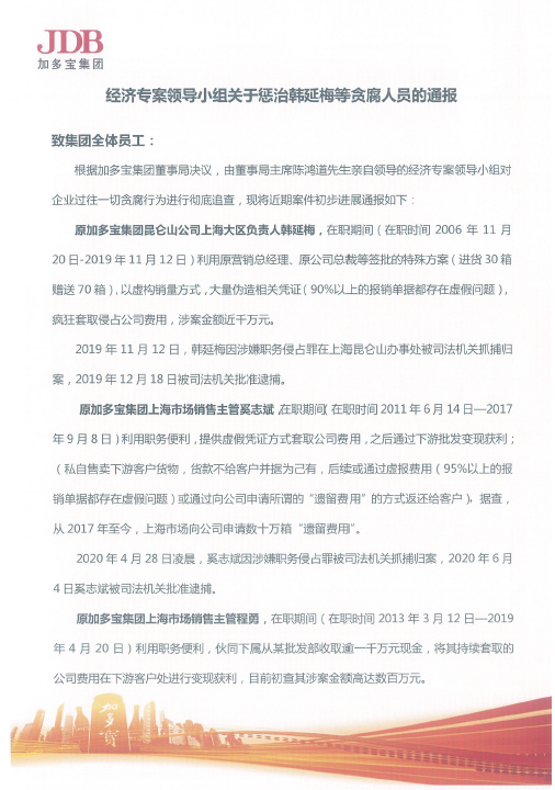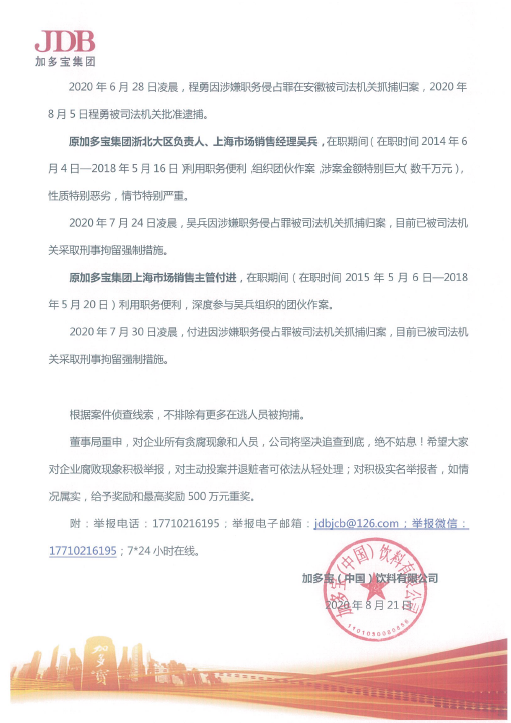 【加多宝集团】加多宝发布反腐公告